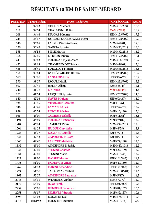 15 coureurs sous les 40', dont une féminine : Luna Langlois. Maxime Feugas améliore son RP de 4'.