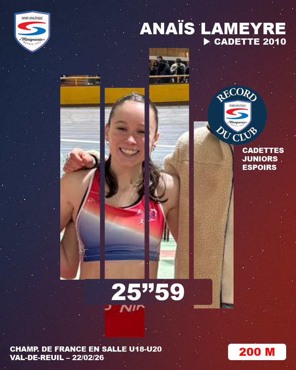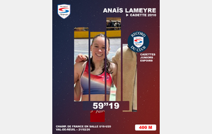 Le dimanche, Anaïs bat un second record du club, sur 200m, en 25''59 (à 9 h du matin) et s'empare des records du club juniors et espoirs en effaçant des tablettes un record datant de 1988 (25''63). Elle termine à 4 centièmes d'une place en finale. Très prometteur pour Anaïs, qui découvre encore ces disciplines.